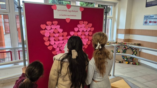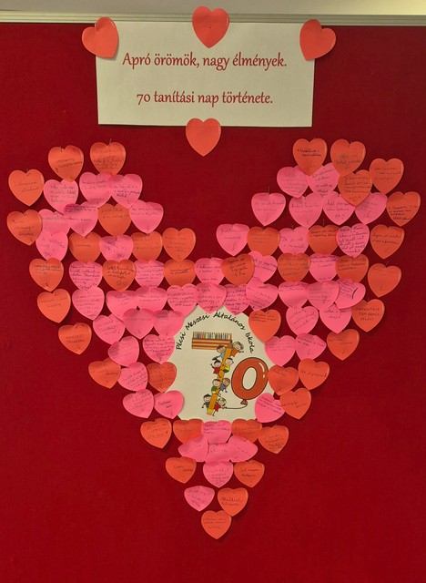 Az iskolánk ebben a tanévben ünnepli átadásának 70. évfordulóját, ezért felső tagozatos tanulóink a 70. tanítási napon megoszthatták, hogy a tanévből eddig eltelt idő alatt milyen meghatározó élményben volt részük. Gondolataikat egy faliújságra gyűjtöttük össze, melyet a szünetekben a gyerekek nagy örömmel olvasnak.