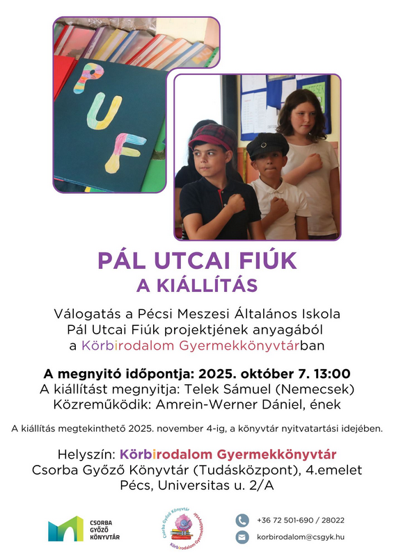 Iskolánk diákjainak munkáiból állt össze egy izgalmas Pál utcai fiúk kiállítás, melynek megnyitója október 7-én, kedden 13 órakor lesz a Körbirodalom Gyermekkönyvtárban. A kiállítás november 4-ig lesz megtekinthető, várunk mindenkit szeretettel!