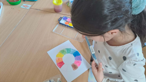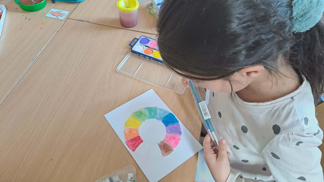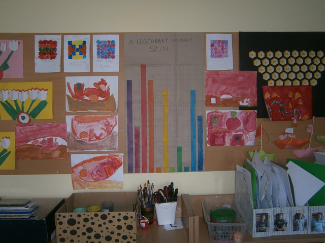 Ebben a témakörben először mesét írtunk arról, hogy egy-egy kiválasztott tárgy, növény hogyan kapta a színét. A gyerekek ötletei alapján a kiválasztottak: Miért zöld a lomb?, Miért fekete a kóla? és Miért sárga a Nap? Ezek után színspektrumot készítettünk a tanteremben található tárgyakból. Szubjektív színhangzatok segítségével kerestük meg a legkedveltebb színt az osztályon belül, amit oszlopdiagramon ábrázoltunk. Erre színre hangolva festettünk csendéletet. Mesék alapján festettünk fehér (Hogyan kapta a színét a hó?) és fekete (Máté Angi: A sötétség) képeket. Minden alkalommal foglalkoztunk a színek érzelmi hatásaival és segítségül hívtuk őket véleményeink kifejezéséhez is.